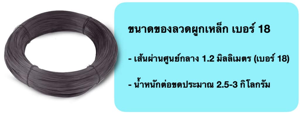 • ลวดผูกเหล็กส่วนใหญ่จะใช้เบอร์ 18 ซึ่งมีน้ำหนักประมาณ 2.5-3 กิโลกรัม ต่อขด